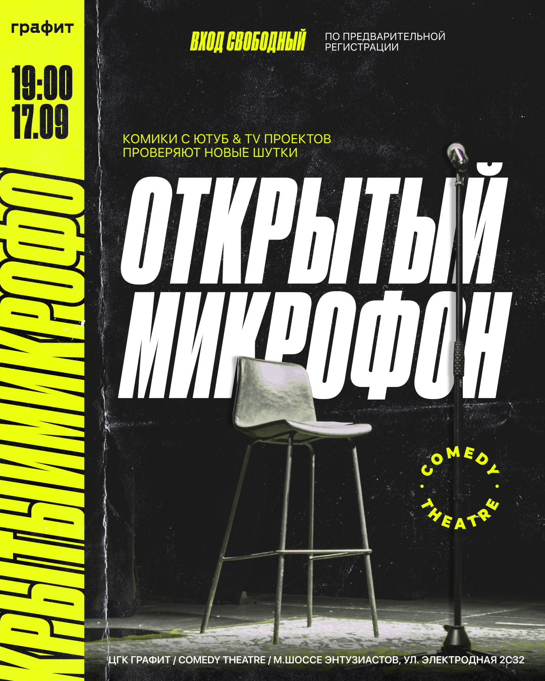 17/09 мы проведем открытый микрофон, на котором выступят молодые и опытные комики Москвы, и ты, кстати, тоже можешь запишись в тг у @sultanius420