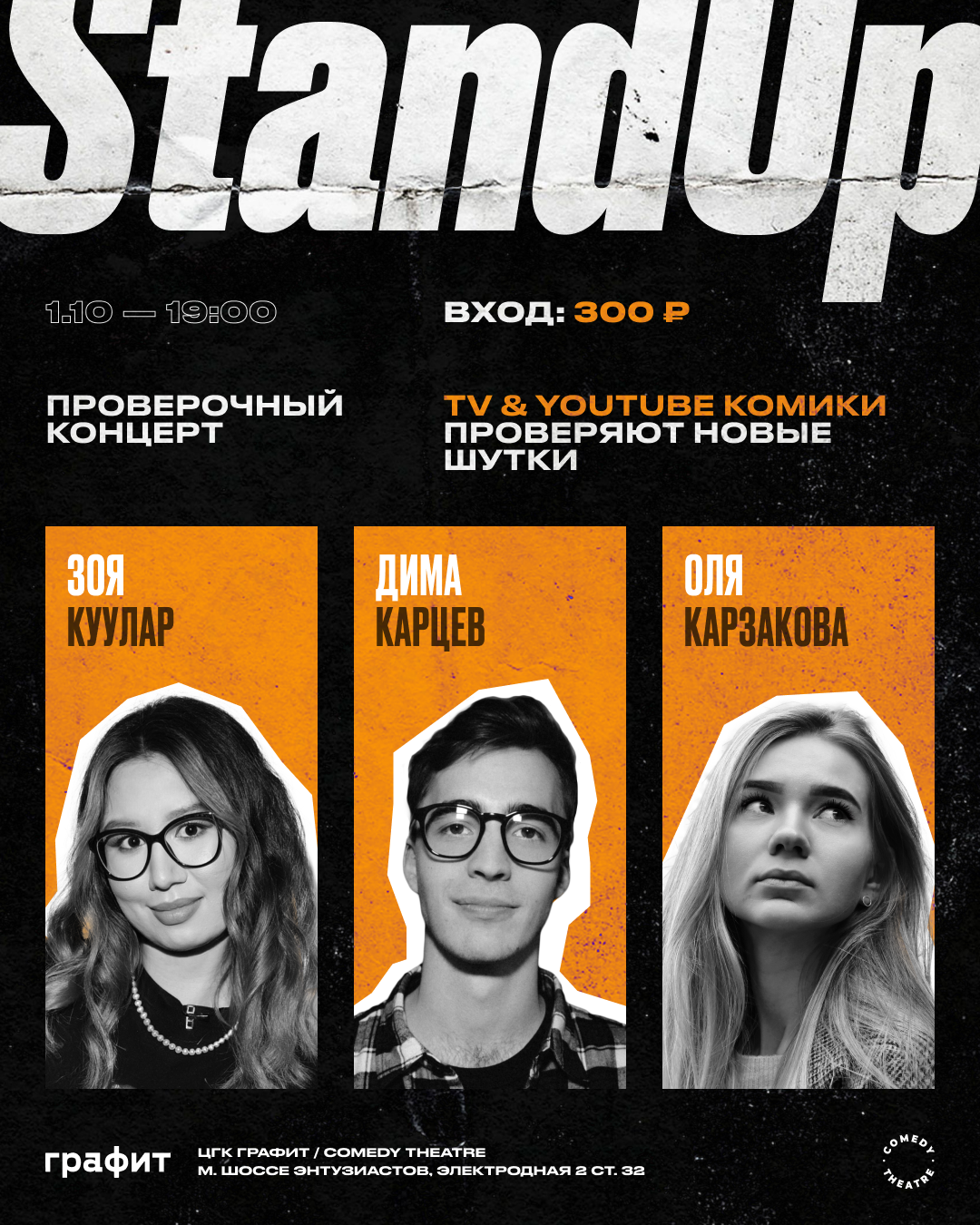 в первый день октября, скорее всего промозглый и прохладный, в стенах comedy theatre будет жарко, ведь в этот день на сцену выйдут участники TV и YouTube проектов, веселые мальчишки и красивые девчонки, которые помогут нам ворваться в октябрь на позитиве!